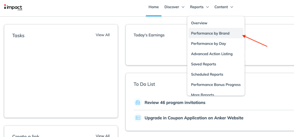 First login to your Impact.com account and then click on Reports -> Performance by Brand.